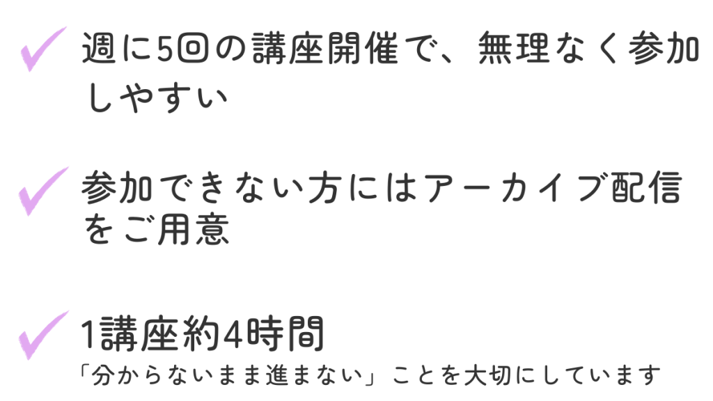 | リアル講座の開催時間 | 火曜~金・日曜 毎回4時間開催 | 月1回程度、2時間程度 | 月に3回、1時間~2時間程度 |